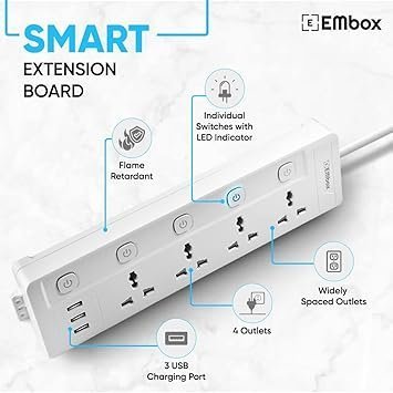 mos EMBOX 10A Extension Board with USB Port- 4 Universal Sockets and 3 USB (2.4 A) Charging Ports with Indicator, 2500W Heavy Duty Cable, 250 Volts (2 Meter Cable)