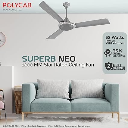 Polycab Superb Neo Star Rated, 1200mm Ceiling Fan For Home | High Speed & Air Delivery | Saves Up To 33% Electricity, 100% Copper, Rust-Proof Blades, 52 Watt | 2-yr Warranty