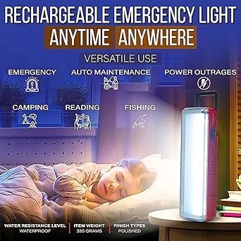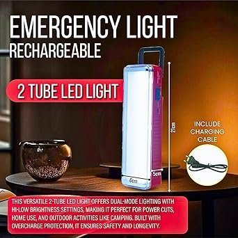 - Superior Rechargeable Emergency Light with Android Charging: Enjoy the convenience of a rechargeable emergency light with Android charging support. This versatile 2-tube LED light offers dual-mode lighting with Hi-Low brightness settings, making it perfect for power cuts, home use, and outdoor activities like camping. Built with overcharge protection, it ensures safety and longevity.