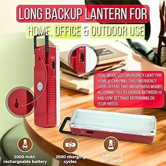 - Long Backup Rechargeable Lantern for Indoor & Outdoor Use: Designed to provide reliable lighting during power outages, this emergency light features a long backup time of up to 7 hours on 7-10 hrs of full charge. The 2000 mAh rechargeable battery is ideal for both home and outdoor use, including camping trips, ensuring you always have portable light when you need it the most.